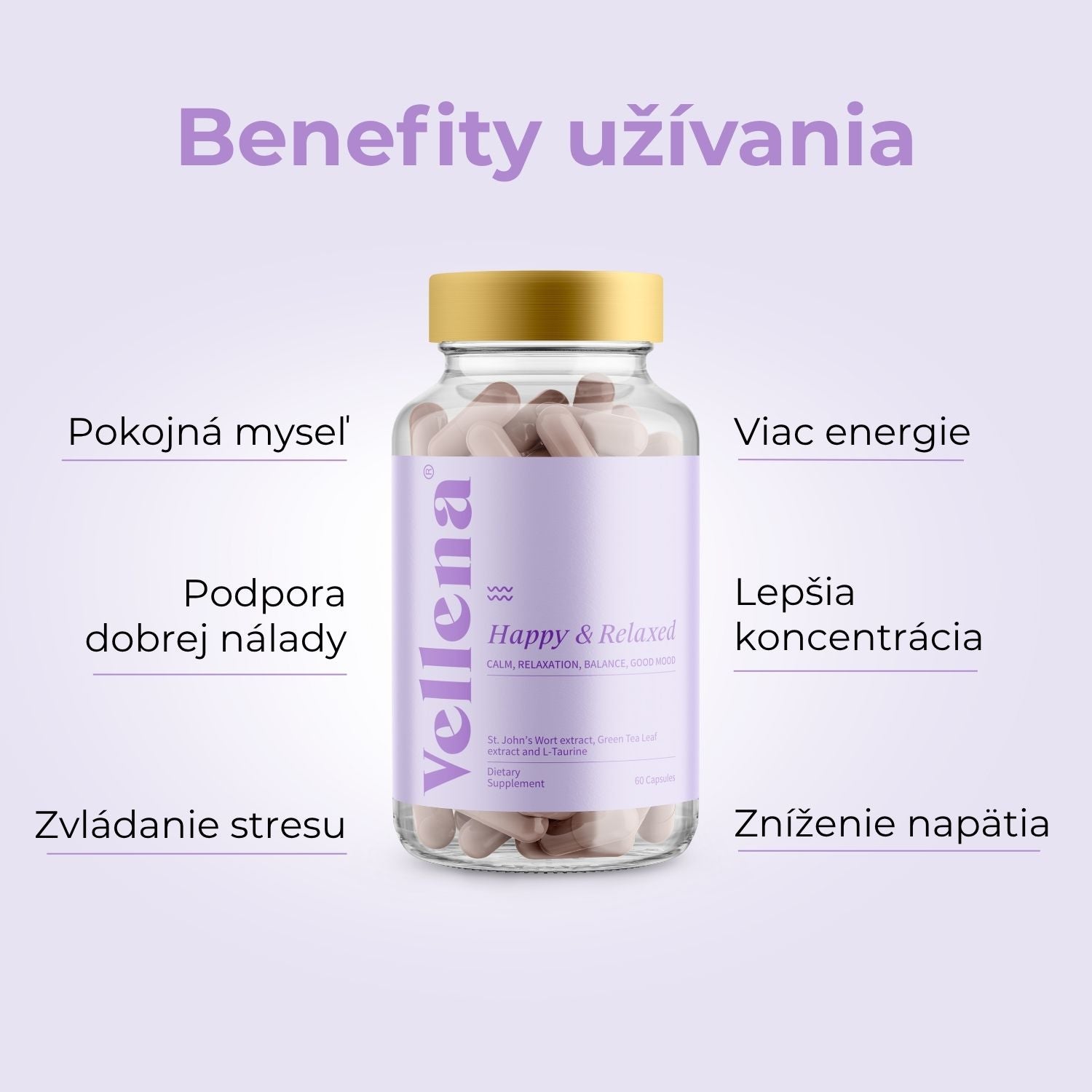 Vellena kapsuly Happy & Relaxed ti pomôžu zvládať stresové situácie, napätie aj únavu. Prírodné zloženie Happy & Relaxed prispieva k psychickej pohode, dobrej nálade a podporuje tvorbu serotonínu - hormónu šťastia.