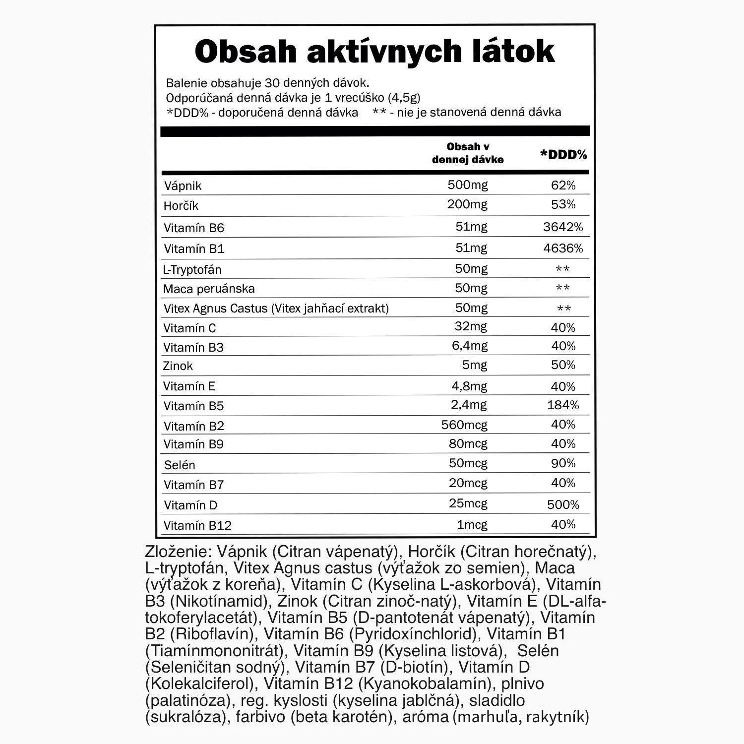 Výrobok neobsahuje alergénne látky vymenované v prílohe č. 1 Vyhl. MZe. ČR č. 113/2005 Zb., v znení Vyhl. č. 368/2005 Zb., č. 497/2005 Zb., č. 101/2007 Zb. a č. 127/2008 Zb. Výrobok neobsahuje a ani nebol získaný z geneticky modifikovaných organizmov podľa direktívy EU č. 1829/2003 a č. 1830/2003. Výrobok svojimi vlastnosťami zodpovedá zákonu č. 110/1997 Zb., v znení neskorších právnych predpisov (319/2007, 4/2008).